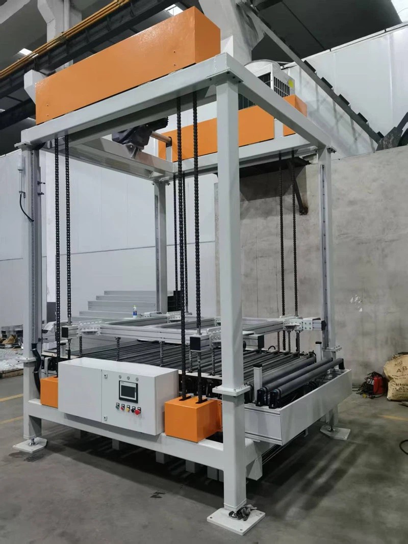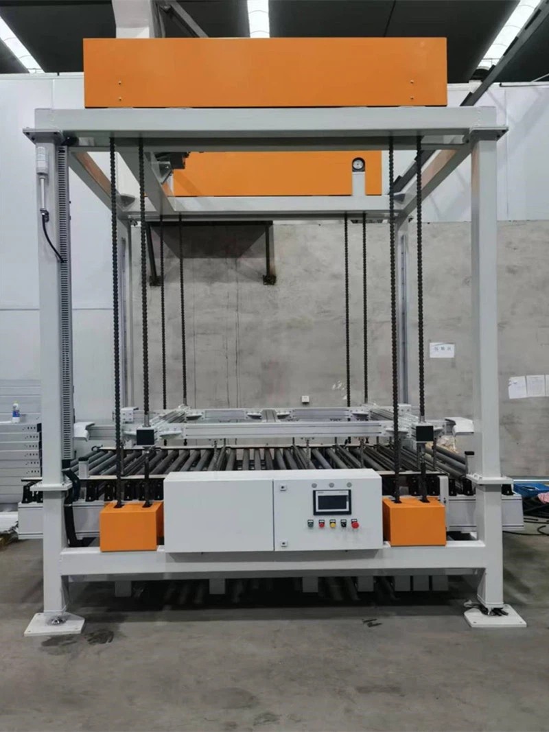 Plate storage machine is composed of drum conveyor line, lifting beam module, driving device and frame module. Plates pass through the roller conveyor line, go into the lifting beam module, controlled by the overall line body to judge the storage needs, and then driven by the driving device to drive the lifting beam to achieve plate storage function. Mainly suitable for various plates or doors.