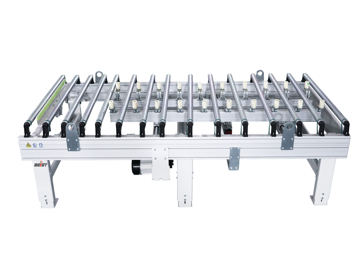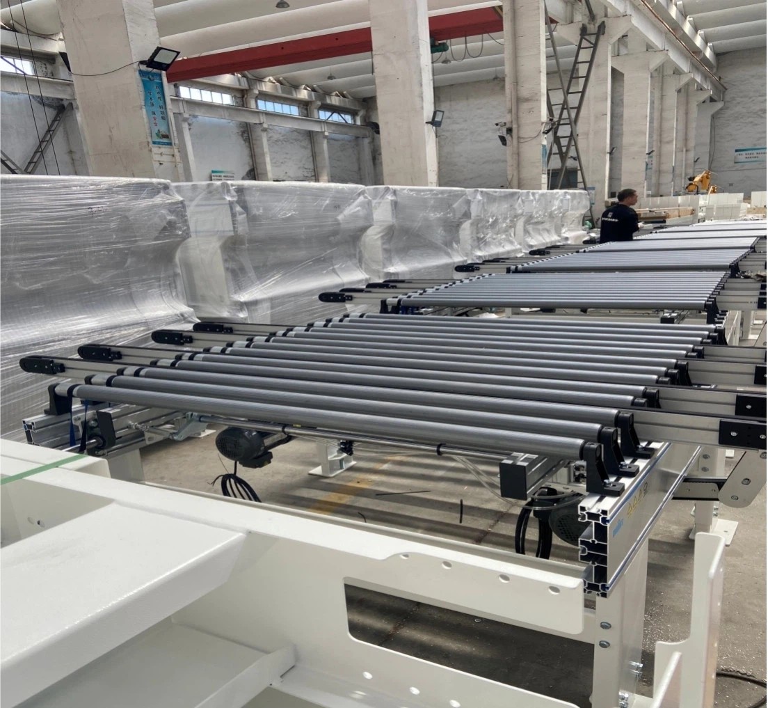 The difference is powered roller conveyor (centre) will let the panels pass from the middle way to match with some machines like sanding machine.